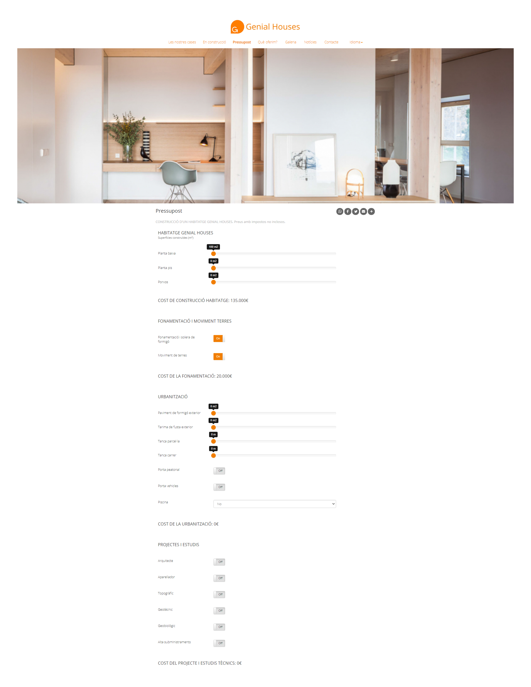 Entrant a l'enllaç PRESSUPOST podeu autocalcular-vos el cost aproximat de la vostra casa en funció de la superfície, fonamentació i moviment de terres, urbanitazció a fer, projectes i estudis tècnics a contractar, amb el plus opcional d'eficiència i estalvi energètic.